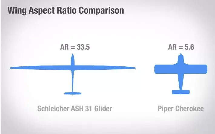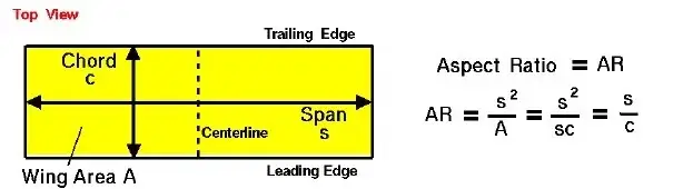 “Aspect ratio is a measure of how long and slender a wing is from tip to tip. The Aspect Ratio of a wing is defined to be the square of the span divided by the wing area and is given the symbol AR.”